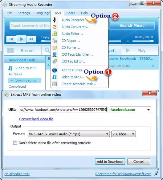 If you want to spare the trouble of installation and registration, then you could choose to use Apowersoft Free Video to MP3 or Fb2MP3 to convert Fackbook video to MP3. However, if you are looking for an application that bundled with more features like audio editing, audio converting, CD burning and others, then Streaming Audio Recorder would be a better choice.